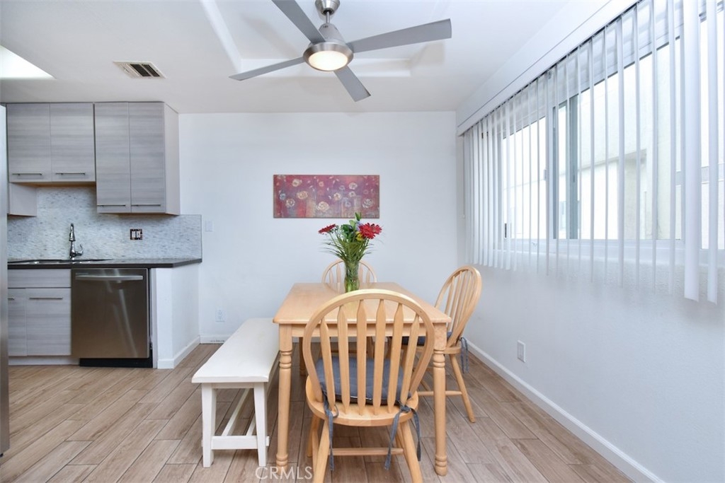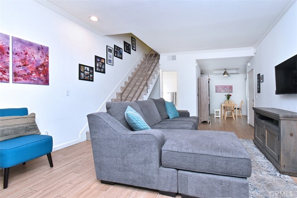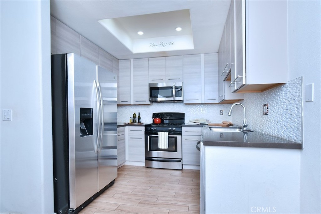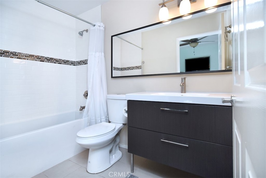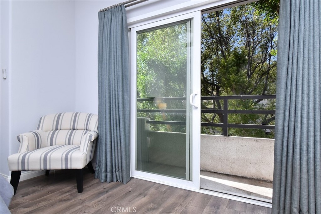 Welcome home to this pristinely maintained, townhome style condo, featuring two outdoor balconies, a private rooftop deck and side by side parking! Enter into a light and bright living room with a cozy gas fireplace, recessed lighting, elegant crown molding and direct access to a long, west facing balcony. The remodeled kitchen features stainless steel appliances as well as modern quartz countertops, sleek cabinetry and hardware, and gorgeous tiled backsplash. Adjacent to the kitchen is a spacious dining area with a stylish ceiling fan and lots of natural light from the nearby window. There is good sized half bathroom that is conveniently located downstairs as well. Upstairs features two bedrooms, each with their own en suite, remodeled bathroom. The bedroom on the left boasts a walk in closet, and the primary bedroom on the right features a ceiling fan and direct access to the second, upstairs balcony. Also accessible through this bedroom is the private and spacious rooftop patio, which is incredibly rare and perfect for entertaining or enjoying some peaceful time alone. Other impressive upgrades include new double paned windows and slider doors, custom upscale drapery, new blinds, and a Nest brand thermostat and smoke detectors, Two assigned side by side parking spaces, as well as guest parking in the garage. The well maintained complex has a pleasant and spacious interior patio and planter area, and features earthquake insurance and security cameras throughout. Located within walking distance to a myriad of coffee shops, restaurants and bars, this turn key home is truly the epitome of the classy and convenient Sherman Oaks lifestyle!