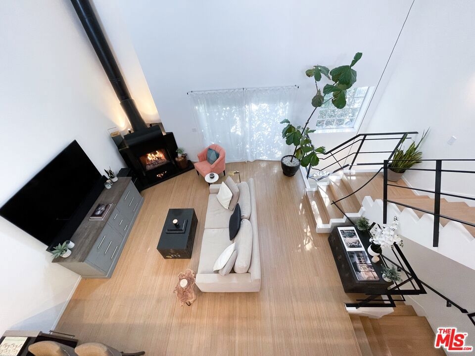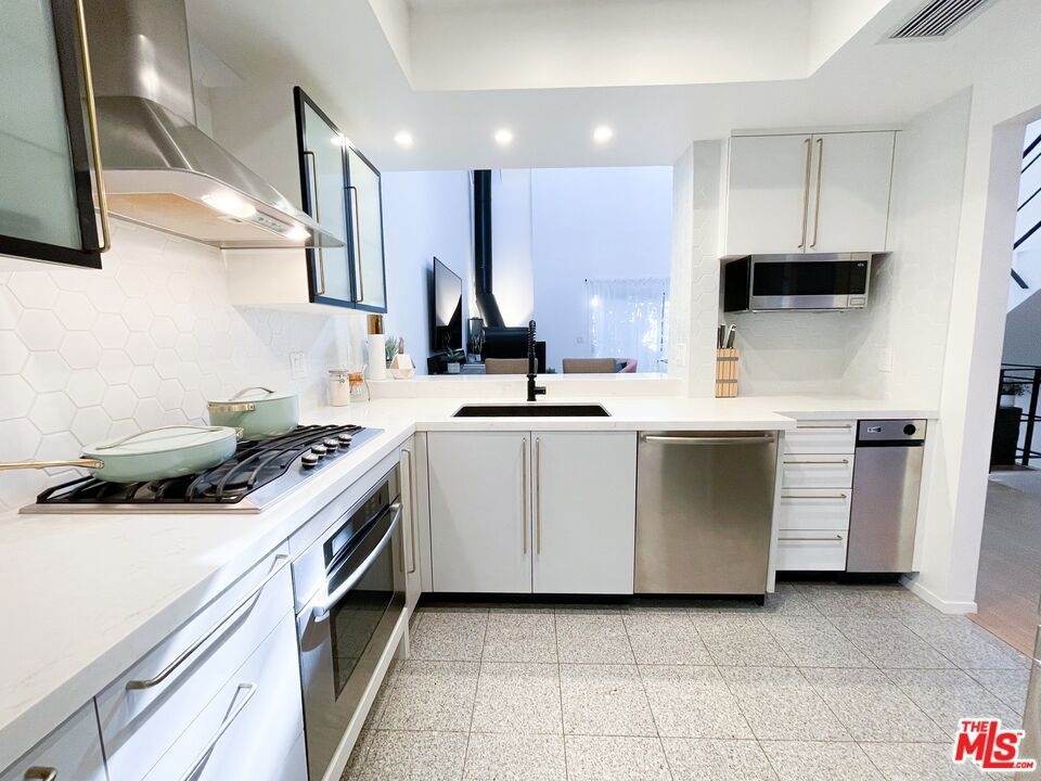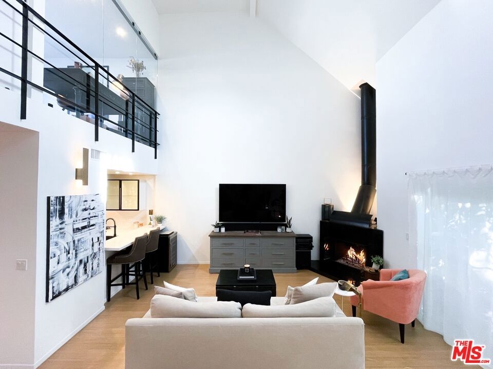 2 Bed/2 Bath Cape Cod condo with 22 ft vaulted ceilings nestled in the heart of Sherman Oaks. Enjoy a private roof-top deck, balcony off of the living area, and sun-soaked open-concept living room with wood burning statement fireplace. This townhouse is newly remodeled, with a fully updated kitchen and stainless steel appliances (including a Viking cooktop and Bosch dishwasher). A washer and dryer is located in-unit off of the kitchen, and a formal dining area opens to the living room. Feel at home in your spacious primary bedroom with walk-in closet, and plenty of storage in both the bedroom and living room areas. The primary bath boasts a skylight, Hansgroehe fixtures, and Toto toilet. Central air and heat throughout the unit. Amenities include pool, gym, and sauna. 2 side-by-side parking spaces in garage with dedicated electric vehicle charging station. HOA includes Earthquake insurance. Within walking distance of great shops and one of the best culinary scenes in Los Angeles. This is the ideal home for young professionals or a young family. This truly is a MUST-SEE.