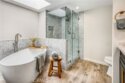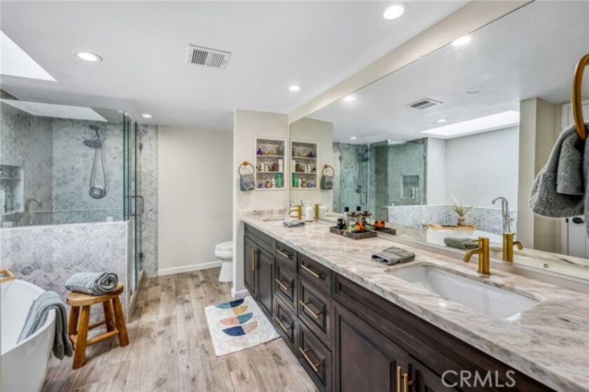 Completely reimagined and turnkey, this sophisticated two-story townhome in an intimate 8-unit Tudor-style enclave offers elevated living in prime Sherman Oaks — with no one above or below you for ultimate privacy. Enter through a secure gated walkway or private direct-access two-car garage into a dramatic, light-filled living space featuring wide-plank flooring, a gas fireplace, and an elegant wet bar with marble counters—ideal for entertaining. The open dining area flows to a private rear patio, while a second front patio provides additional outdoor space for relaxing or hosting. The fully remodeled kitchen showcases custom cabinetry, quartz countertops, stainless steel appliances, a breakfast area, and convenient side-by-side laundry. A brand-new central air system ensures year-round comfort. Upstairs, both bedrooms feature their own ensuite baths. The spacious primary suite offers vaulted ceilings, a gas fireplace, and abundant natural light. The spa-inspired primary bath highlights marble tile and counters, dual vanities, soaking tub, separate shower, and a generous walk-in closet. The secondary suite is well-sized with its own remodeled bath. Low HOA dues include water, sewer, trash, common area maintenance, and earthquake insurance. Walking distance to Ventura Boulevard’s coffee shops, restaurants, bars, as well as Sportsmen's Lodge, and located within the coveted Dixie Canyon Community Charter School district.