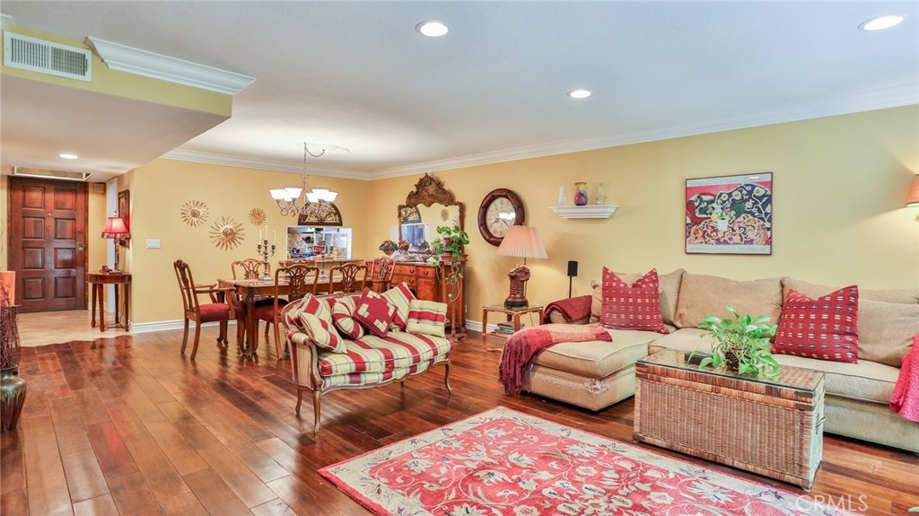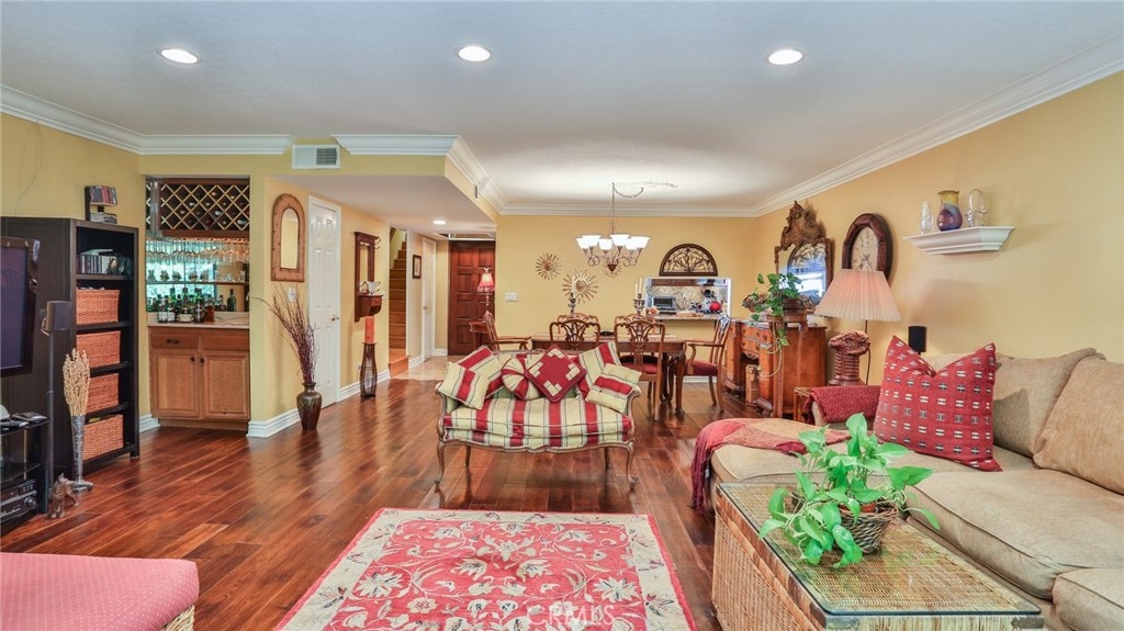 FALL IN LOVE with Sherman Oaks Townhouse living.  This 2 bed / 2.5 bath / 1544 sq ft townhome has been beautifully updated with the utmost care.  An impressive main floor greets you as you enter through your private entrance.  To your left, a chef’s kitchen boasts high end custom cabinetry, granite counter tops, stainless steel appliances, travertine tile floors, under cabinet lighting and a pass through window to the dining area.  Follow incredible hardwood floors to an open concept living/dining room that features a fireplace feature, crown molding, recessed lighting and wet bar that is perfect for entertaining family and friends.  A true Master Retreat awaits upstairs, offering stunning vaulted ceilings, his and her closets with built in shelving, wainscoting details and a private balcony.  The master en suite features marble tile flooring, granite covered double sink vanity and full length mirrors.  A spacious second bedroom with en suite, in unit washer/dryer closet and recently updated HVAC system complete the top floor.  A private garage offers 2 tandem parking spaces, private storage space for each unit and secure, controlled access.  Centrally located between the 101 freeway and Ventura Blvd, you’re moments from Sherman Oaks & Studio City shops, restaurants and night life.  Welcome home.
