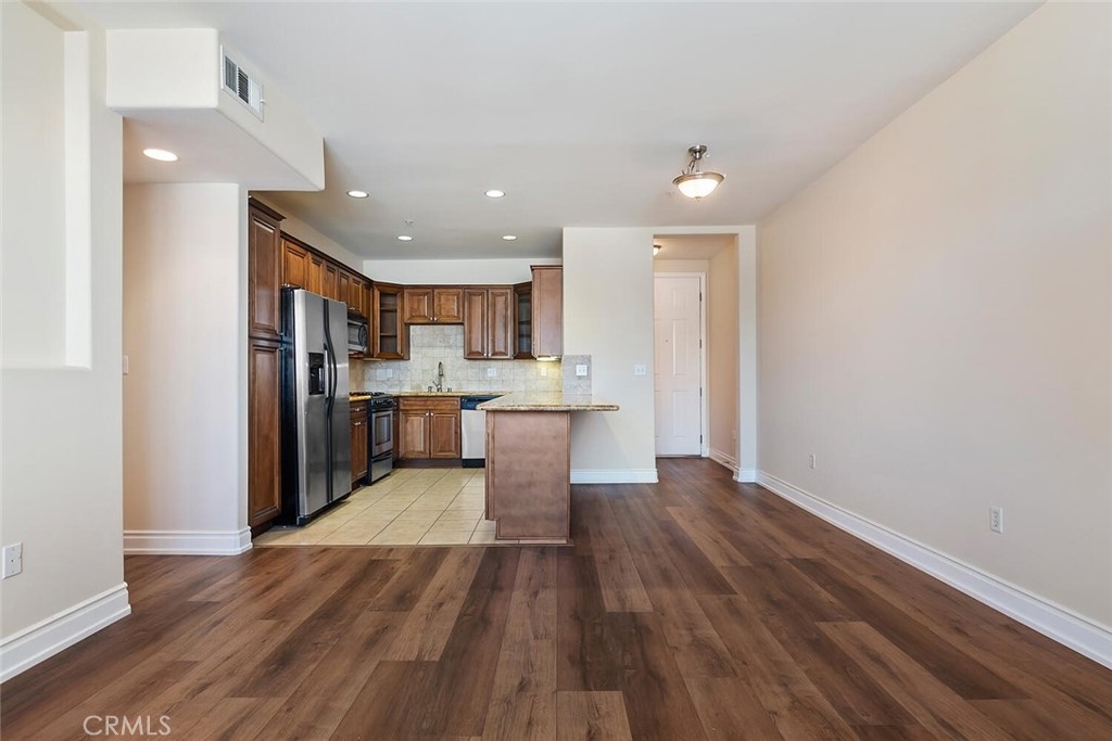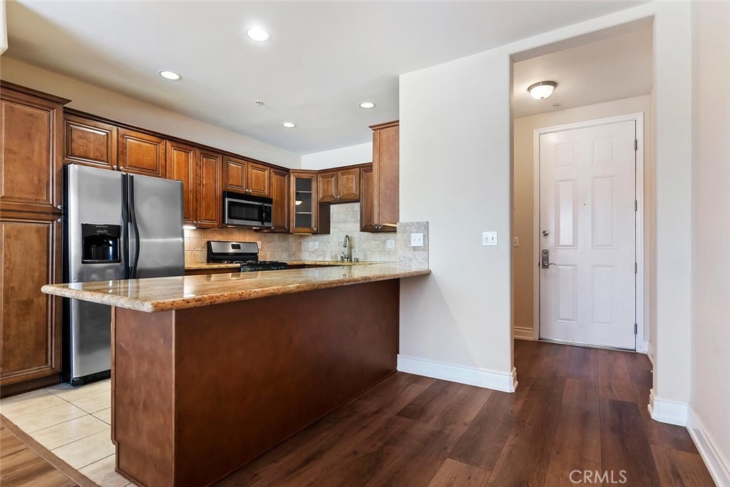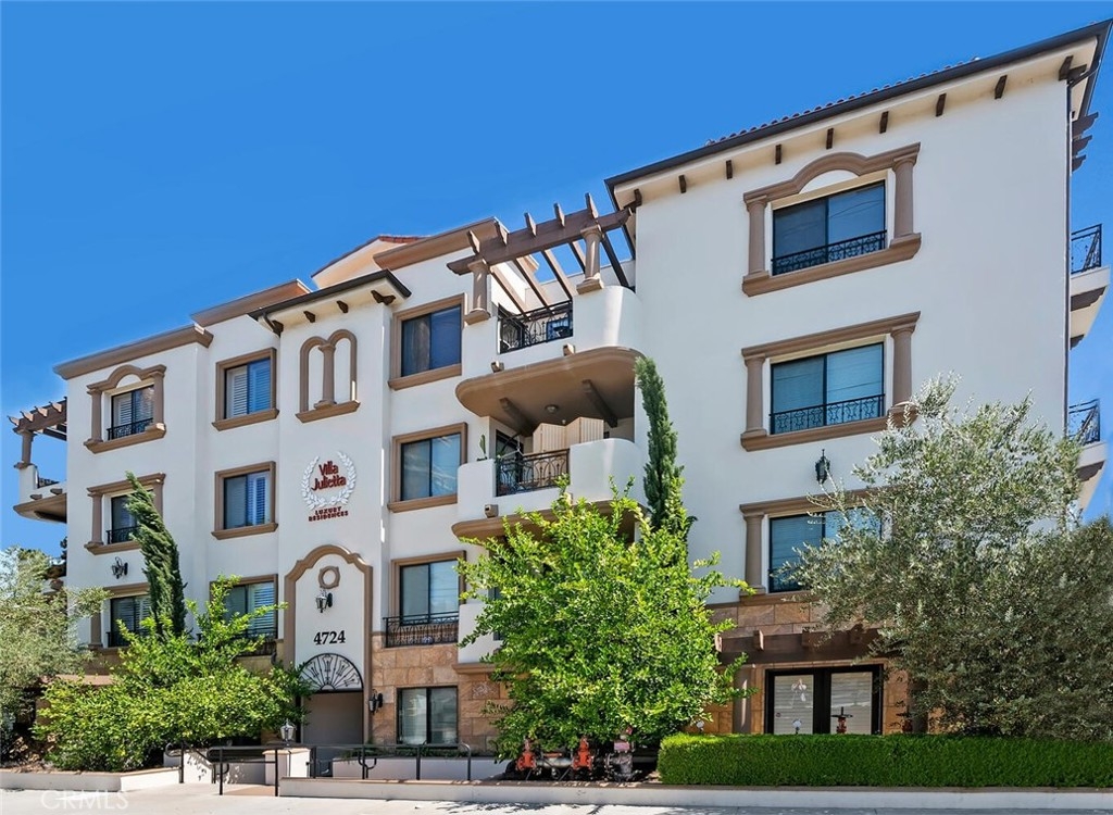 Desirable Sherman Oaks location! 2/bed, 2/bath unit with 1070 Sq. ft. located on the top floor in the rear corner of Villa Julietta which was built in 2009. The open floor plan creates a warm and spacious atmosphere. The living area has gorgeous luxury vinyl plank floors, custom plantation shutters throughout a fireplace with custom mantle and beautiful sconce lighting. The kitchen would please any chef with generous maple cabinets, granite counters, stainless steel appliances and a large breakfast bar with an extra seating area. The primary bedroom has an in-suite luxurious bath with dual vanity, over-sized step-in shower with glass enclosure and a spacious walk-in closet. Balcony access from the primary bedroom with mountain and neighborhood views. Second bath has a tub and shower with granite counters. There is an in-unit laundry area with stackable washer/dryer. Community amenities: Gym with sauna, two baths and spacious outdoor lounge area to relax. Gated and secured entry, elevator, intercom and 2/car assigned garage parking. Conveniently close to Pavilions, Ventura Boulevard shoppings, gourmet restaurants and more. Easy access to 101/405 freeways.