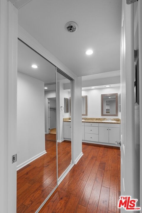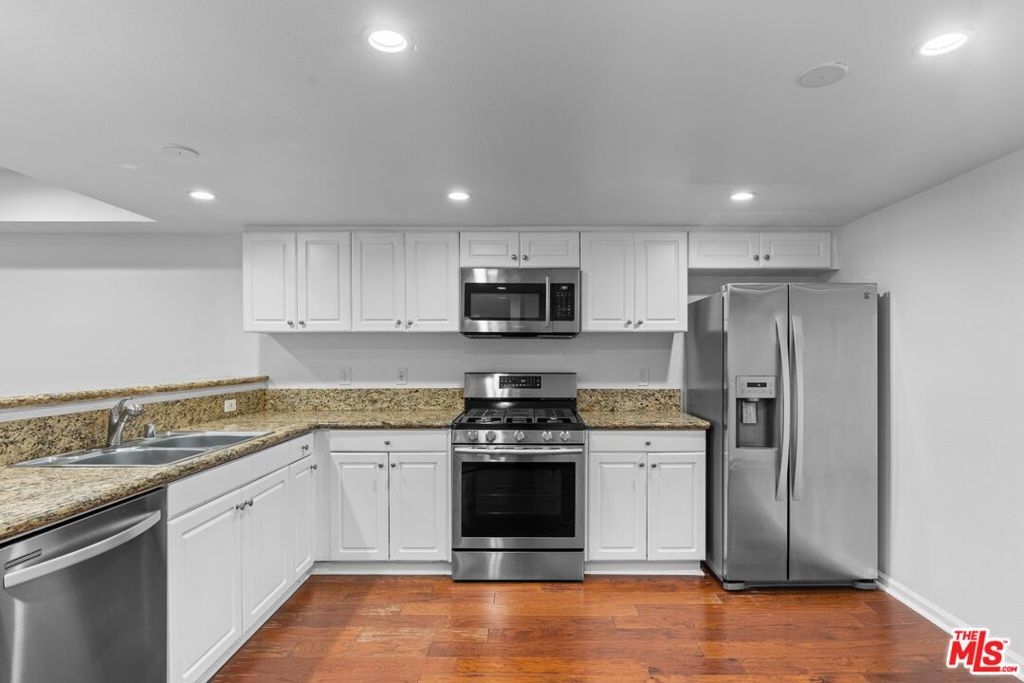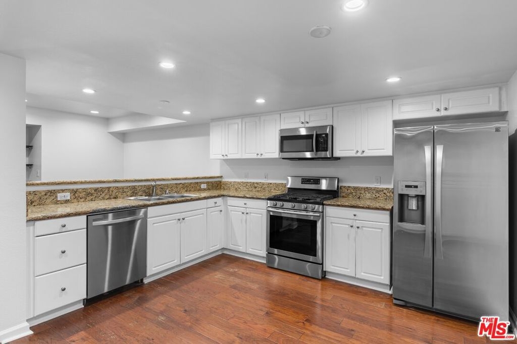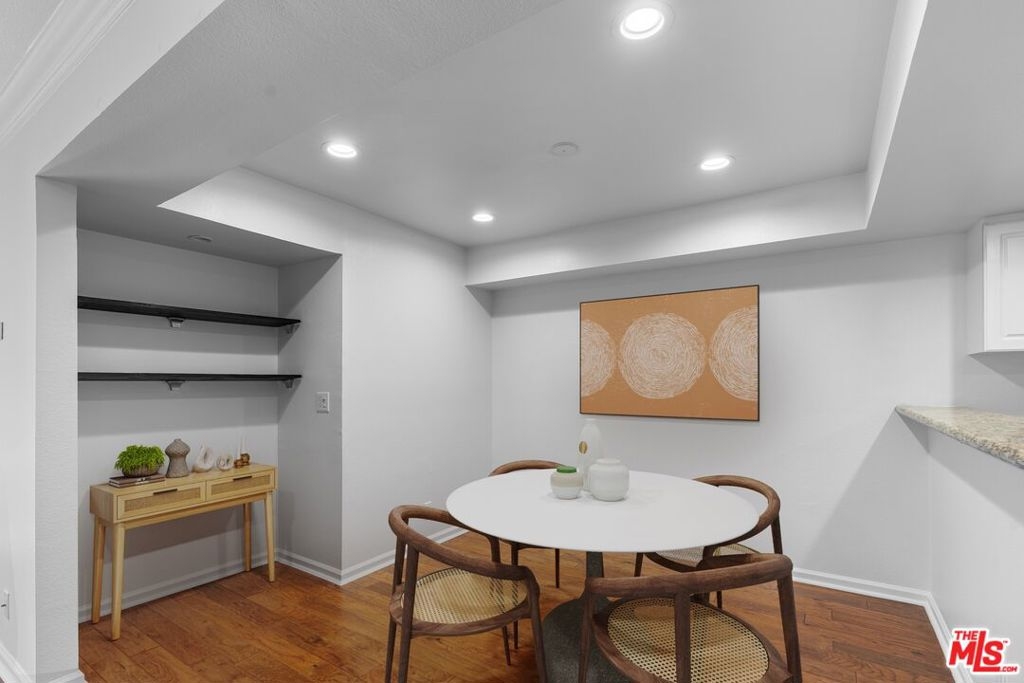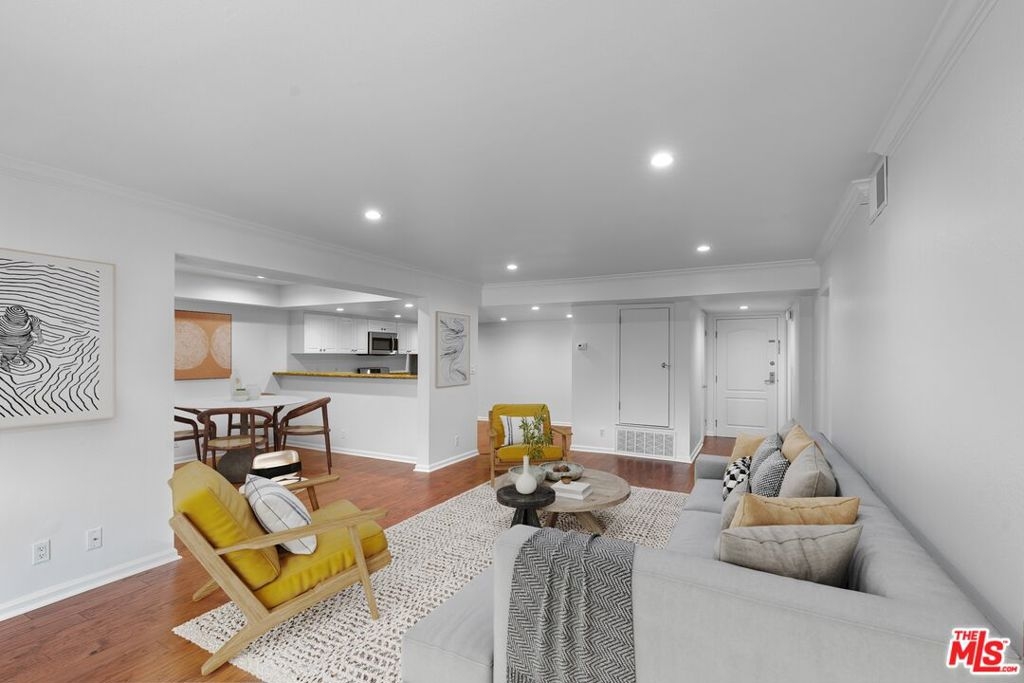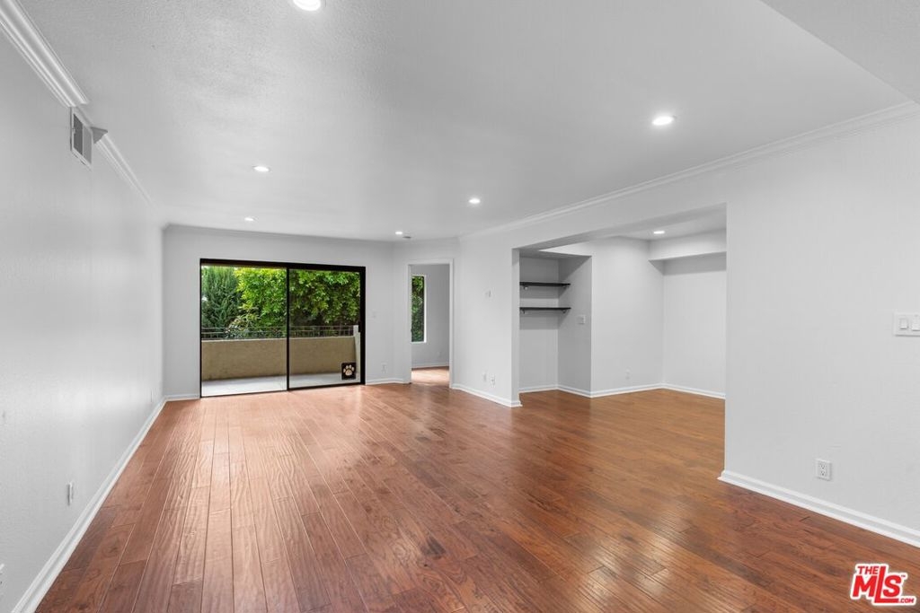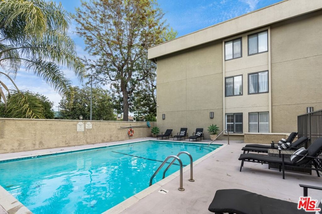Expertly maintained single-level top-floor 2 bed/ 2 bath condo in the heart of Sherman Oaks. Located on the quieter backside of the building, this unit beams with natural light from the private outdoor patio into an open floorplan living space. This condo has been freshly painted top to bottom and features engineered hardwood floors throughout, ample storage space, and in-unit laundry. The spacious kitchen is outfitted with a pantry, breakfast bar, and stainless appliances.The primary suite offers a luxurious escape with a soaking tub, dual vanity sinks, and multiple closets including a roomy walk-in. Entertain outside with resort-like amenities including pool, outdoor lounge featuring a fireplace and BBQs, as well as an indoor clubhouse with bar and a flatscreen TV. The condo includes 2 designated parking spaces within the subterranean gated garage. Live minutes to all the offerings of Sherman Oaks and Studio City on Ventura Boulevard, access to the 101 Freeway, and the Fashion Square Mall.